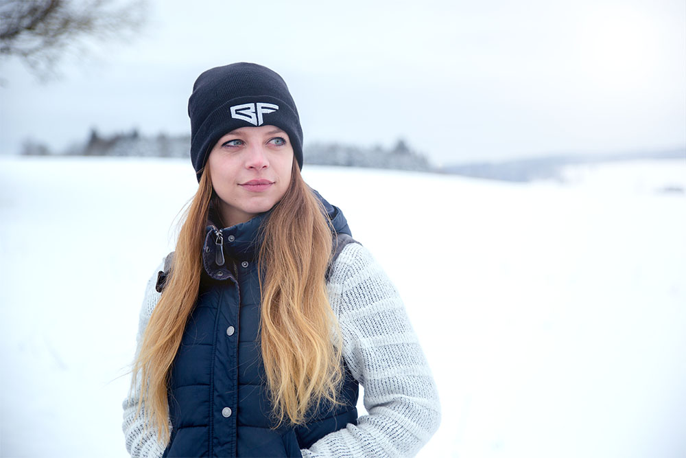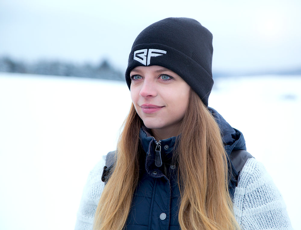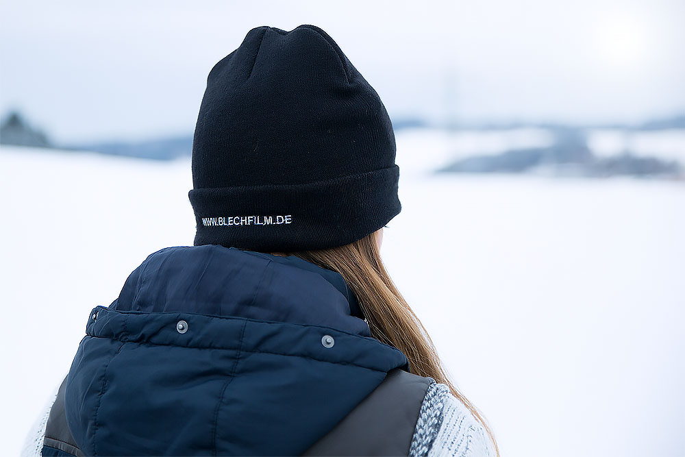 blechfilm Wintermütze in schwarz mit BF Logo auf der Vorderseite und www.blechfilm.de Schriftzug auf der Rückseite.